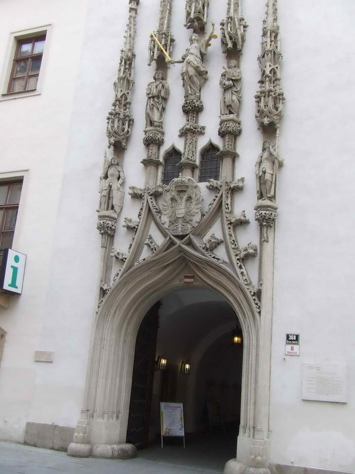 В инете много сведений про вход в информцентр Брно, где можно взять карты, проспекты и купить магнитики (в других местах они почему-то не продаются – и это не только в Брно, в следующих городах было то же самое). Так вот, прямо над входом в I в арке висит крокодил и колесо.
