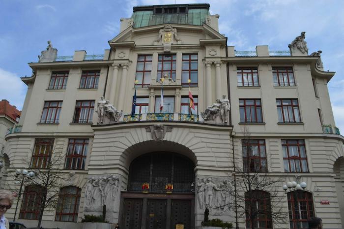 или не обратили бы внимание, что это здание с обнаженными на фасаде — мэрия Праги: