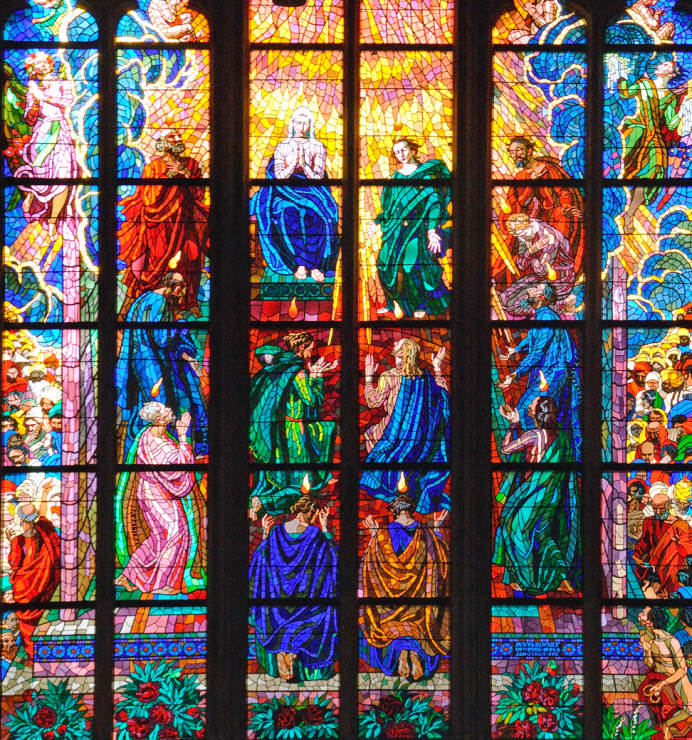 Колокольня высотой сто метров. Сто двадцать четыре метра длина нефа. При этом это же не просто кирпичная коробка. Фасад отличается украшениями, даже в чём—то вычурными. А издалека с восточной стороны напоминает гигантского черного паука, такая вот архитектура. Но самыми впечатляющими в соборе оказались витражи. Огромные колонны, арки стрельчатые, капеллы, всё очень здорово, но витражи незабываемы.