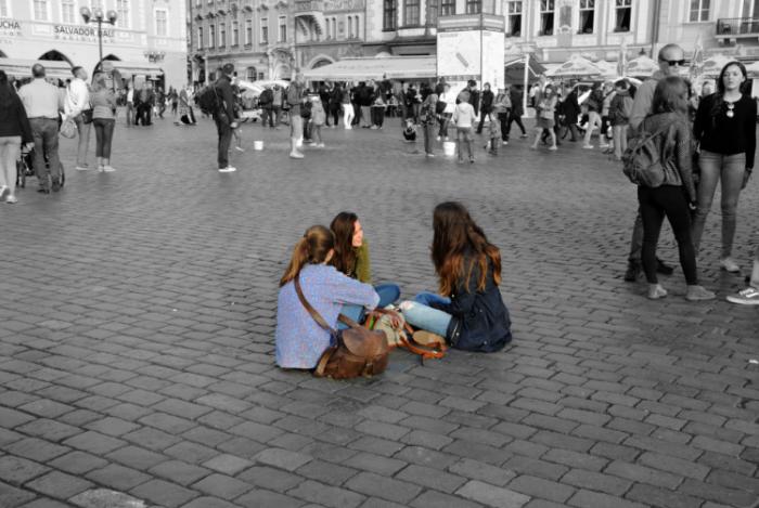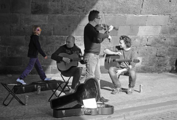 Перейдя мост, мы опять пришли на Староместскую площадь. Здесь готовятся к вечерненочным выступлениям. Музыканты в разных концах устанавливают аппаратуру и распеваются, зрители, в основном конечно молодежь, устраиваются прямо на булыжники.