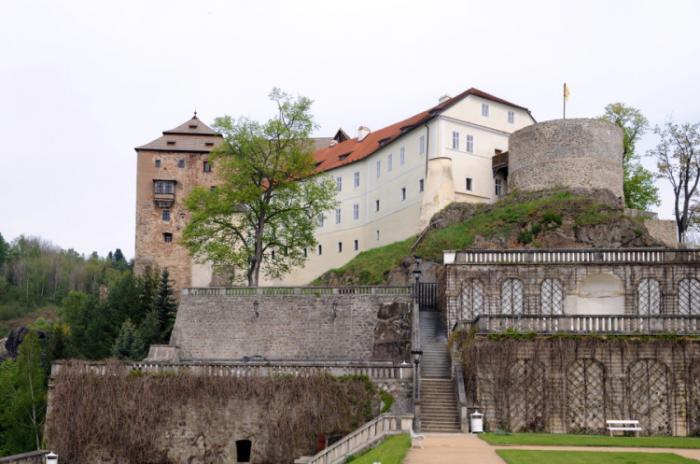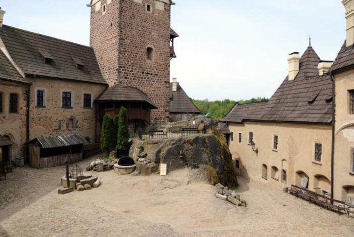 В считанных километрах от Карловых Вар есть замок Локет. Сам одноименный городок весьма живописно уместился внутрь подковы течения реки Охры. Название взял из-за того, что излучина реки напоминает изгиб локтя. Только игрушечные домики исторической части. Местность строго ограничена, и расти вширь городу некуда. Крепость, как водится, на возвышенности. Внутренний двор небольшой, но удалось пройтись по вертикали. Есть возможность забраться на самый верх башни, где обитает добрый дракон, к которому в давние времена селяне обращались за огнем.