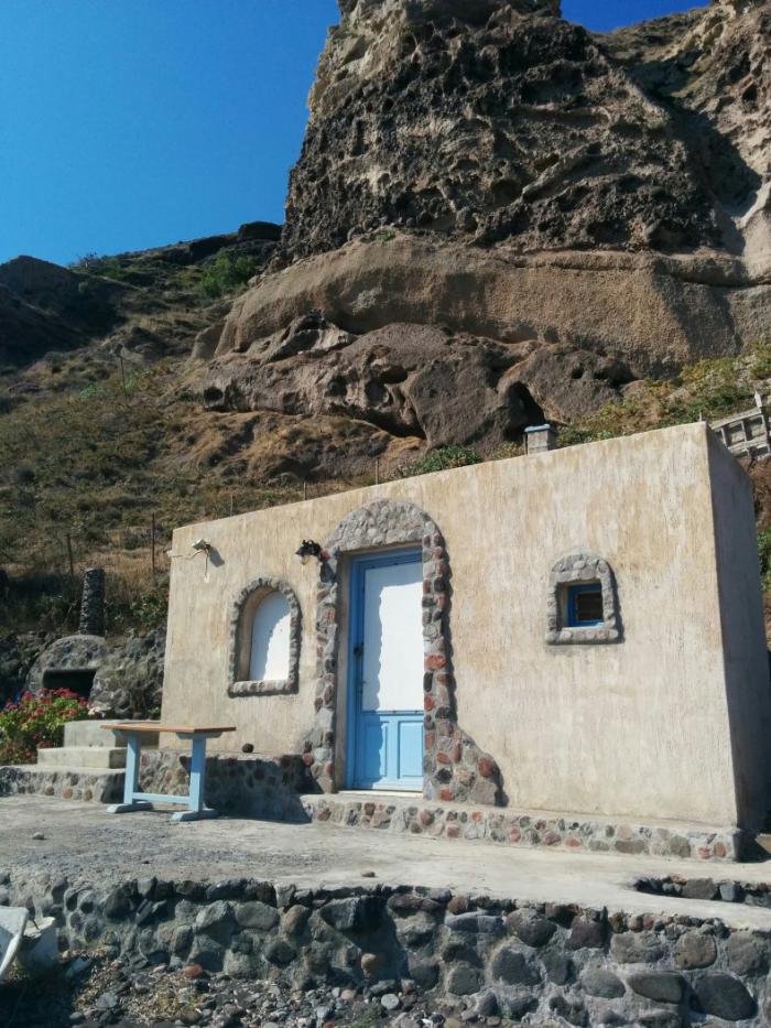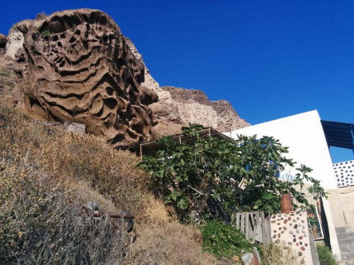 Позавтракав часов в 8 в нашем 2* яйцами и бутербродами так, как, примерно, мы это делаем в будний день у себя на даче, мы отправились в направлении Акротири, смотреть какие-то раскопки. Но по дороге свернули в потрясающее место. Это оказалось чем-то типа рыбачьей лодочной станции прямо напротив вулкана. Вот в этих горах, в стенах их склонов все изрешечено летевшими от вулкана валунам. Некоторые так и продолжают торчать, а большинство со временем выпало из выбитых ими гнезд и лежит на берегу. Потрясающая картина следов чудовищной стихии. Эта гора оплыла как свеча от жара…