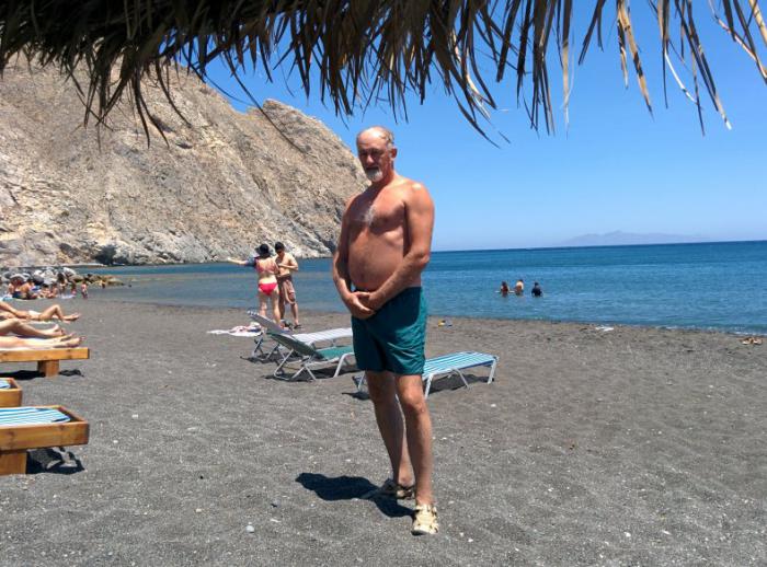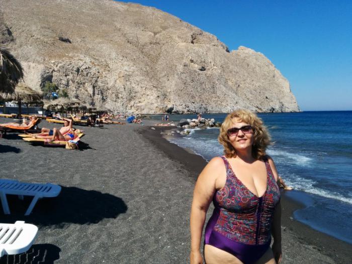 Первая точка – вулканические пляжи с черным песком. Поезжайте именно в Периссу (Perissa), а не в Камари. Она чуть дальше (15 км. от Фиры вместо 12), но находится за потрясающей горой-мысом, которая защищает пляж от волн. Желательно иметь с собой коралки, т.к. заход в некоторых местах своеобразный: по черному песку вы заходите по голень, а дальше начинаются плоские каменные плиты с небольшими отверстиями.