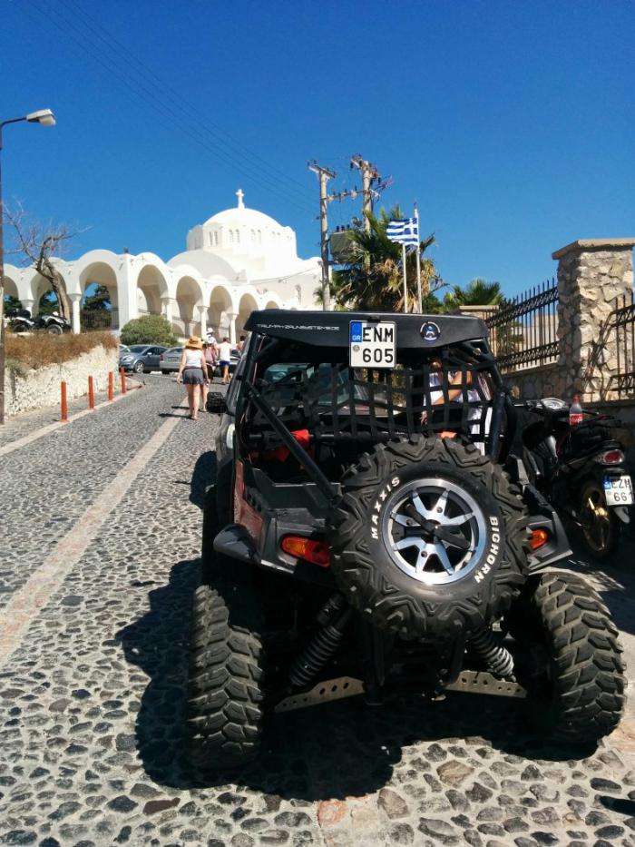 Стоимость почти во все концы около 2 евро. Аэропорт был виден из нашей гостиницы в Фире, но путь на автобусе до нее из аэропорта занимает около 25 мин. По дороге нам стали встречаться стаи квадроциклов, багги и скутеров. И хотя мы планировали перемещаться по немеченым маршрутам в течение трех дней на автобусе, уже по дороге мы решили, что сейчас срочно что-нибудь арендуем.
