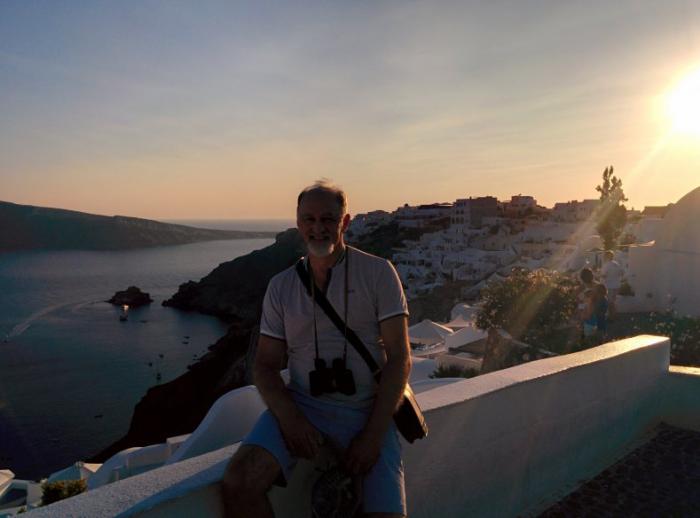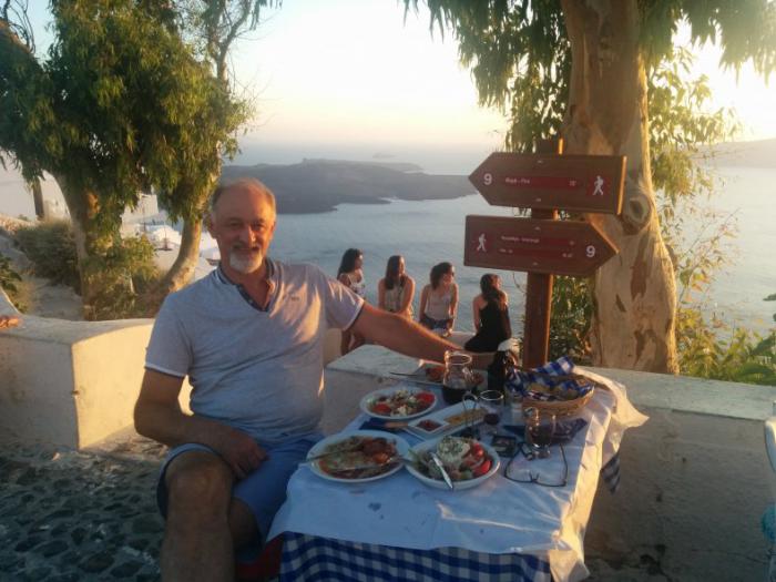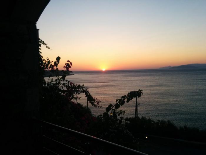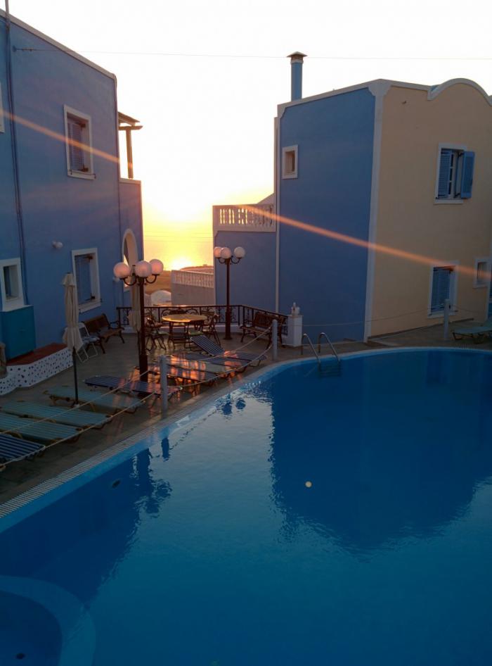Быстренько приняв душ, и впечатлившись видом с нашей огромной террасы, мы побежали что-нибудь арендовать и срочно поехать кататься. Забыл… еще перед этим я сориентировался на местности. Из номера был вид на восточный берег, а в 100 метрах от отеля в горку открывался вид на запад. Здесь несметное количество таверн, в одну из которых я зашел и забронировал столик на 19 часов для совершения главного местного туристического ритуала – посадки солнца в море. В эти дни это было в 20.36.
