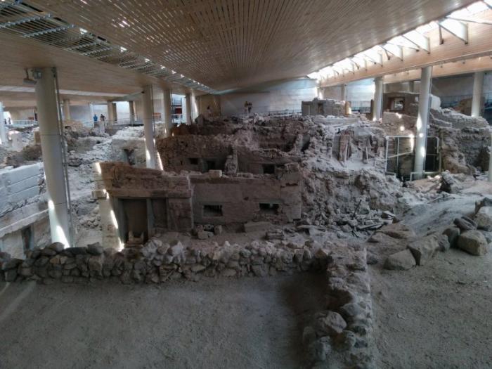 В отличие от Кносского дворца на Крите здесь чуть меньше следов новодела. Хотя экскурсоводы не скрывают, что все это продукт компьютерного моделирования возможного поселения, которое было сделано в Массачусетском университете. Как, видимо, и проект всего этого комплекса. Очень удобного, кстати, для посещения. Под крышей и с хорошей вентиляцией.
