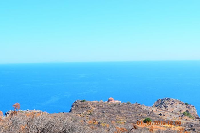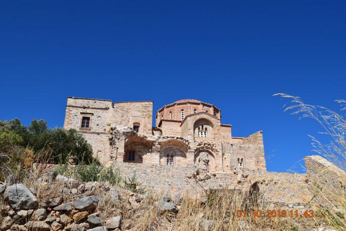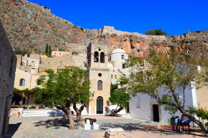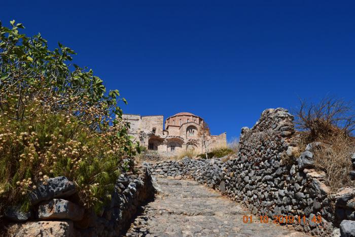 Хотя здесь всё рядом. Во времена расцвета в Монемвасии было 40 церквей, сейчас их значительно меньше — 24. Обходить мы их не будем, но ещё одну церковь посмотреть нужно, самую знаменитую — Собор Святой Софии. А для этого нам по скале нужно залезть во-о-о-н туда.