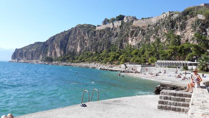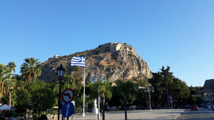Дорога к ближайшему пляжу проходит мимо крепости Паламиди, туда пойдём завтра.