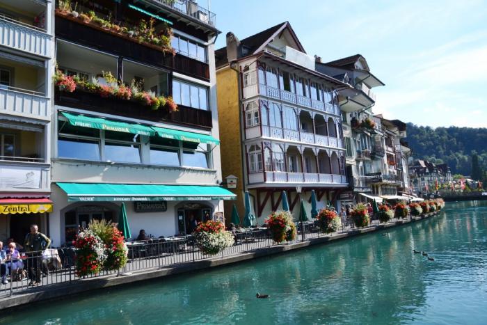 Хотя сразу по приезду в Тун, вечером, мы не смогли оценить очарования города. Конечно, в этот день позади были впечатления от Юнгфрау и Аарского ущелья, так что конкурировать с величественными картинами природы среднестатистический швейцарский город не мог. Мы, конечно, после заселения в отель …. Походили по центру, зашли в ресторан, да как-то с выбором не сложилось. Я какую-то пиццу невнятную съела, а вот Андрею повезло: к заказанному мясу подали ему по швейцарской традиции варенья, инжира, винограда, так что он потрафил своим