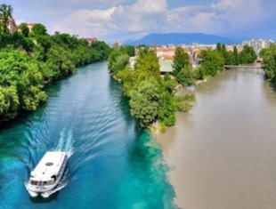 На этой фотке из интернета изображено слияние двух рек – Роны и Арва — в черте города Женевы.