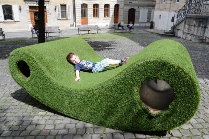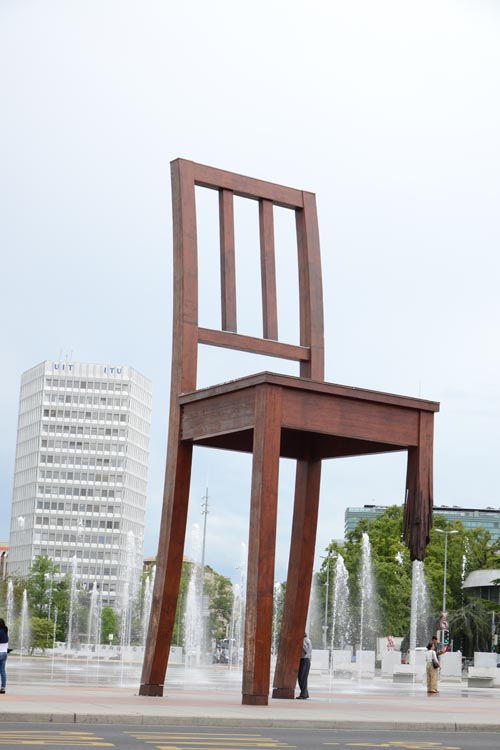 Напротив европейской штаб-квартиры ООН находится впечатляющий памятник — стул высотой 12 м на трех нормальных и одной обрубленной ножке, который символизирует жертв противопехотных мин, остающихся без конечностей в местах минирования и военных действий. Очтасти упрек ООН в бессилии разрешения конфликтов.