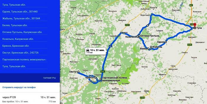 Карта маршрута: Одоев — Белёв – Жабынь — Оптина Пустынь – Козельск – Брянск – Овстуг — Партизанская поляна