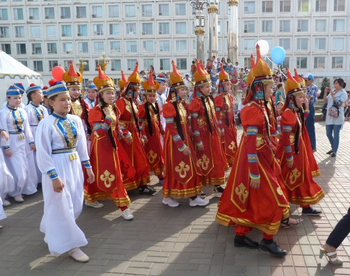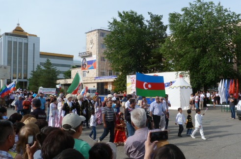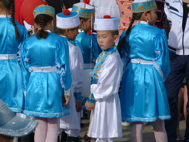 Центральная площадь им. Ленина (все-таки я точно раскусил того каменного «созерцателя») была полна народа в «многонациональных» костюмах. Хотя калмыки и составляют уверенное большинство населения в своей столице, здесь множество и других национальных диаспор, причем, похоже, весьма активных. Под бодрые объявления ведущих праздника по площади маршировали представители казачьих дружин, фольклорных коллективов, дагестанских и прочих землячеств, а из толпы их поддерживали соответствующие зрители.