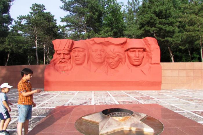 Возле довольно странно окрашенного барельефа — цитата из все того же Джунгарчи о готовности умереть за Родину.