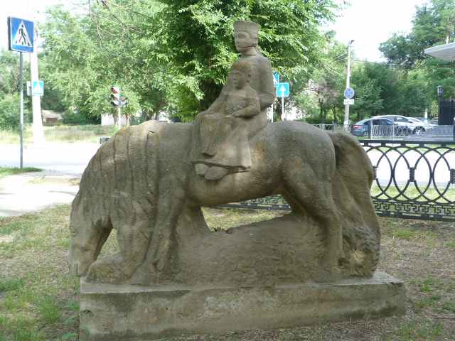 По замыслу автора, скульптура должна повествовать о мирном прошлом калмыков. Ну, не знаю… и прошлое было не слишком мирное, и с ребятенком на коне по степи скакать — это тебе не безмятежным созерцанием заниматься. Скорее уж, мне этот памятник как раз о кочевых днях, о вольной степи напоминает. Был у моей мамы случай, далеко отсюда, в Сибири. Приехали к ним в экспедиционный лагерь каюры на оленьих упряжках, стали разгружать поклажу и обнаружили, что по дороге ребенка потеряли. 8-\ От оленя отвязался. Ничего, вернулись по собственным следам, нашли, обратно привязали. =\ Это так, просто вспомнилось.