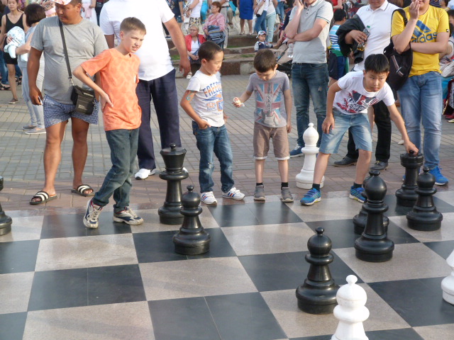 Зато на обратном пути, на пл. Ленина попытались принять участие в местном чемпионате. Мои мальчишки, хоть и не калмыки, но тоже эту игру любят, Семен уже на II взрослый разряд претендует. А в центре города для игры создали все условия — мимо шахматных фигур тут, в буквальном смысле, трудно пройти.