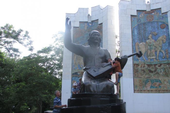 Чуть дальше встречаем масштабную скульптурную композицию, посвященную самому почитаемому эпосу калмыков — «Джангар». Точнее даже не самому эпосу, а джангарчи — исполнителю этих песен, без которых не обходилось раньше ни одно празднество, ни одна встреча степняков. Эдуард, наш друг-калмык, как христианин видит в «Джангаре» вложенную Богом в людей тоску по бессмертию, вечной молодости, вневременному миру, который там ищут герои. А наши слегка безголовые отпрыски увидели в памятнике отличное место, чтобы полазать. Мы их, конечно, оттуда сняли, но поразмяться они уже успели на все 100.
