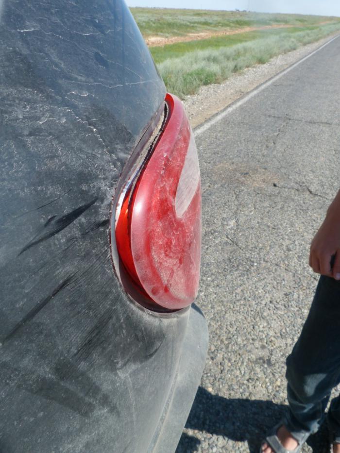 Тот самый задний фонарь, замену которому я купил в самом начале путешествия в Новгороде, начал колебаться. В смысле, разрываться между мечтой о свободе и привязанностью к нашей машине. Мы попытались избавить фару от этой болезненной раздвоенности с помощью скотча и ласковых слов. Возможно, если бы дорога сохраняла постоянный уровень сложности, это бы и помогло. Но скромные ямки на трассе уступили место наглым дыркам в дорожном покрытии: