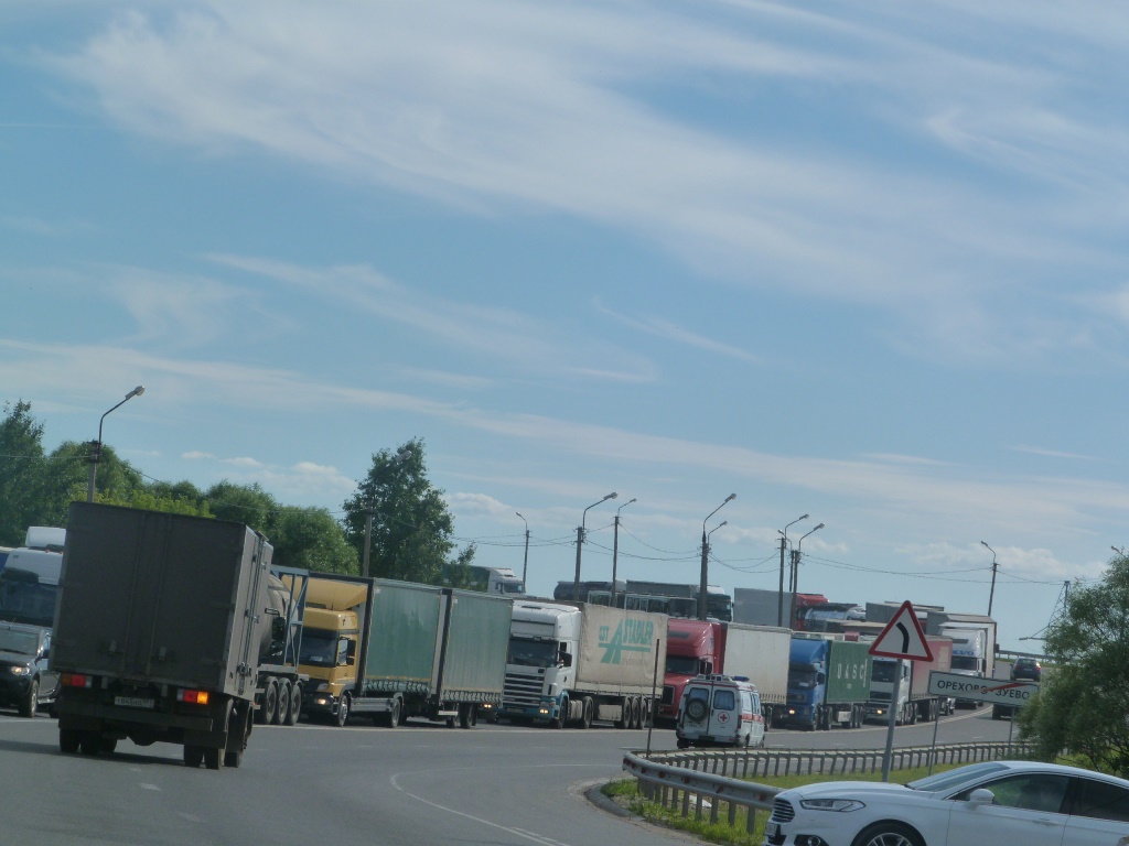 Со всеми этими разговорами, приключениями и погонями — выехали мы только в 12:15. Через полчаса сворачиваем на М5, где специально для нас положили новый асфальт. Еще через 15 минут покидаем пределы Рязани. Одолев за полтора часа 115 км, мы поворачиваем на А108. Это, возможно, было не самым лучшим решением. Я всегда пользовался этой трассой, чтобы обойти московские пробки, но это было до ограничений для грузового транспорта на МКАД. К сожалению, как я уже упоминал, навигатор яндекс у меня был недоступен. Так что не знаю, что в этот день творилось на других трассах. Но на А108 было плохо…