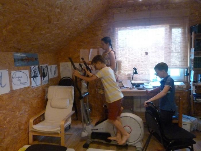 Семья наших друзей в это время отдыхала заграницей. За домом и симпатичным псом-хаски присматривали их знакомые, которые нас очень гостеприимно приняли. Накормили, поиграли с детьми в настольные игры — в общем, сделали все, чтобы мы хорошо отдохнули с дороги. А на чердаке, где мы устроились на ночлег, еще и тренажеры были — дети тут же поняли, что вовсе и не устали еще…