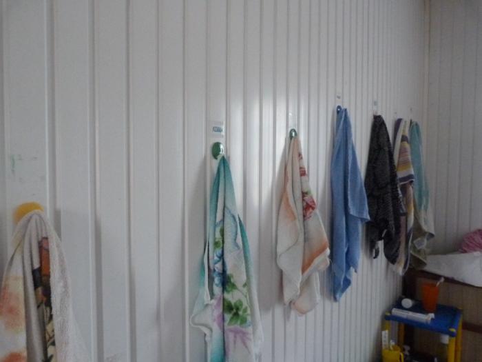 Наутро мы обнаружили, что в душевой прорвало трубу, и она затоплена. Хозяйка с помощником тут же принялись решать эту проблему, а нас отправили наверх, во вторую душевую. Заодно мы полюбовались оригинальным решением проблемы: что делать, когда раковину купили не по размеру санузла: