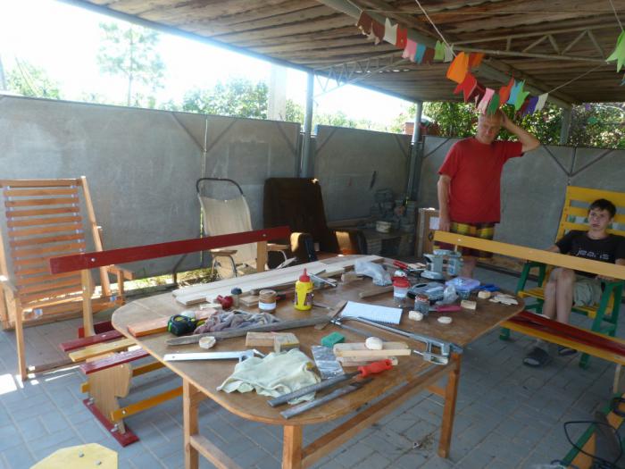 Отец семейства активно вовлекает пацанов в изготовление всевозможных полезных вещей, для этого на участке отдельная беседка с инструментом и материалами.