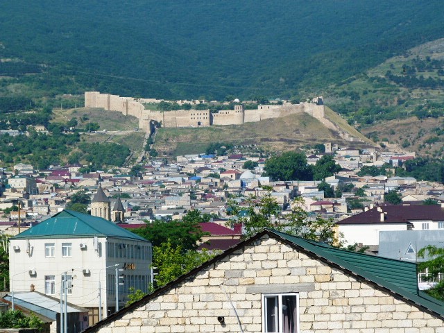А вот как крепость Нарын-Кала выглядела утром из нашего окна.