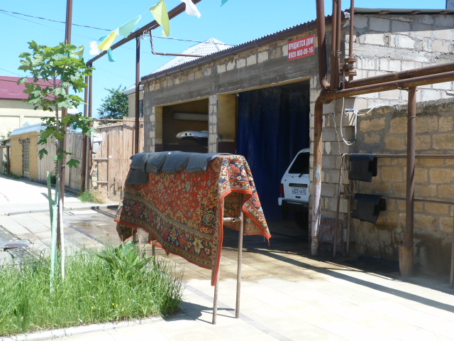 Особых проблем мы с этим не ожидали. С самого въезда в Дагестан предложения вымыть машину (в основном, в виде открытой площадки и шланга) встречали нас через каждый километр пути. Сотрудницы гостиницы, действительно, сразу подсказали нам мойку неподалеку. Правда, там нас не приняли. Задумчиво оглядев наш тарантас, хозяин мойки присвистнул и честно признался, что у него нет сейчас средства, чтобы отмыть следы от насекомых. Однако он посоветовал нам проехать чуть дальше, попробовать счастья там. Вторая попытка оказалась более успешной. Мойка выглядела вполне по-восточному: коврики тут стирают вместе с настоящими коврами.