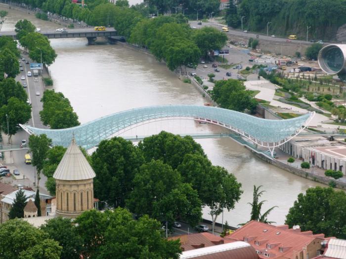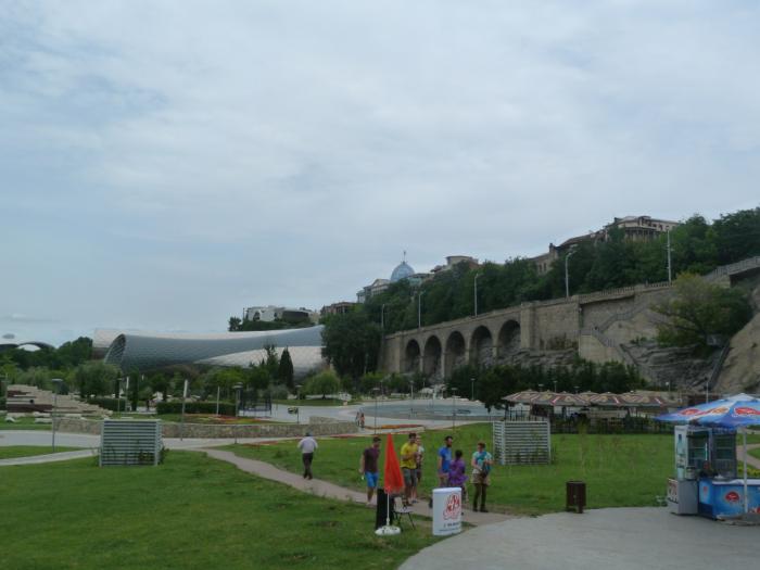 Пешеходный мост Мира был построен по проекту итальянского архитектора и французского дизайнера при Саакашвили в 2010 г. Этот очень нелюбимый в нашей стране президент Грузии вообще питал слабость к прозрачным зданиям и конструкциям, чего стоят одни полицейские участки, просматриваемые насквозь! Для него это было символом новой Грузии, избавленной от вековых традиций коррупции и кумовства. «Прокладка», как его обозвали острые языки, не могла не вызвать ожесточенных споров при своем строительстве. Слыханное ли дело, в центре древнего города такое стеклянное безобразие воткнуть? А вот ведь вписался каким-то образом… стал связующим звеном между старыми кварталами города и новым парком, разбитым у другого его конца. Теперь без него трудно городской пейзаж представить. Один в один — история Эйфелевой башни в Париже. Говорят, ночью мост еще и подсвечивают красиво, но мы сами не видели.