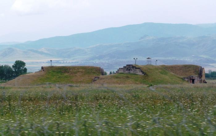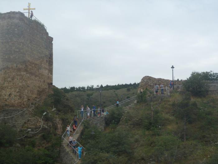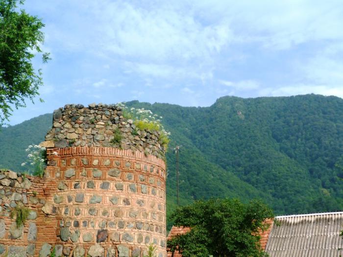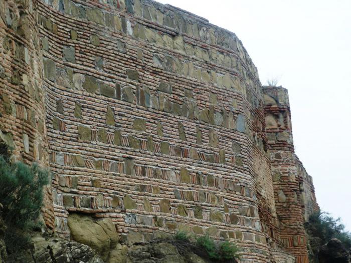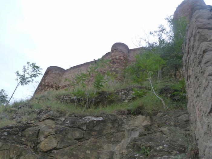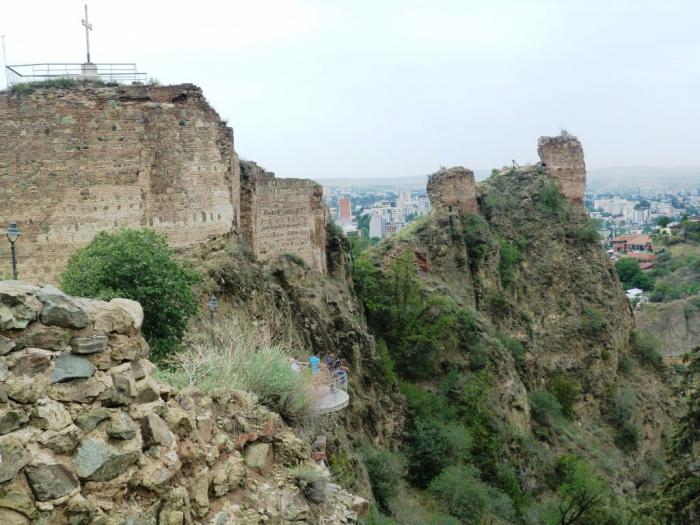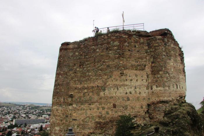 Ну а совсем рядом с нами сама крепость обосновалась. Считается, что укрепления на этом месте существовали еще до легендарного купания фазана в тепленькой серной водичке. А вот название Нарикала твердыня получила куда позже, то ли от персов, то ли от монголов. Хм… что-то знакомое… точно! В Дербенте крепость тоже Нарын-кала называлась. Любили в те времена крепости «маленькими» называть. Скромничали. Ну, маленькая да удаленькая. Город разрушали снова и снова, а крепость за всю ее долгую историю практически ни разу не удалось взять штурмом. Увы, но все творения человеческие — лишь на время. Мощное землетрясение в 1827 г. сделало то, что не сумели совершить свирепые завоеватели. От неприступной твердыни остались живописные руины, которыми мы и любовались со смотровой площадки.