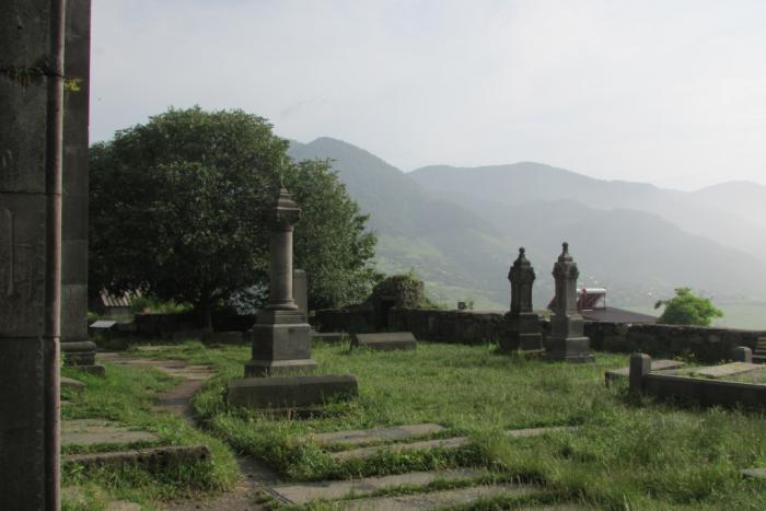 Если кто был там, может подскажет, правильно ли я идентифицировал этот «вулкан» как монастырь Санаин (Sanahin)? Что там могло так дымить, я в любом случае не знаю. Но может быть, монастырь обиделся, что мы поехали в Ахпат, а не его осматривать, и задымился от гнева. Эти два соседствующих монастыря издревле соперничали за внимание людей. Ревнивый характер не посещенного нами монастыря можно увидеть даже в его названии. Дело в том, что и Ахпат, и Санаин основаны примерно одновременно. Но считается, что само название Санаин в переводе означает: «этот древнее того!». =)