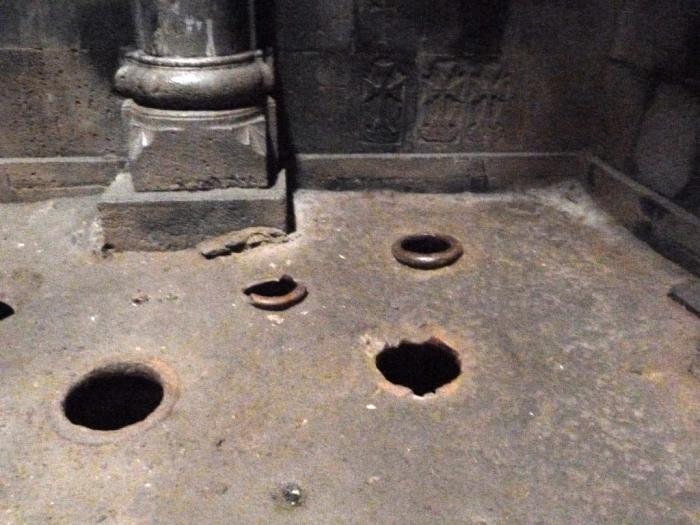 Такие кувшины либо зарывали в землю, либо ставили в специально приготовленные дырки в полу. В Грузии такие хранилища нередки, а вот в Армении это чуть ли не единственное монастырское хранилище подобного рода.