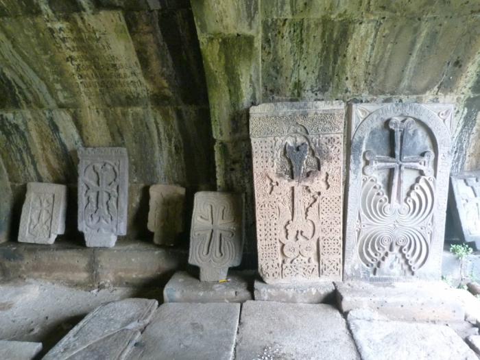 Мне они показались похожими на Газаван в монастыре Татев, куда нам еще предстоит доехать. Там такие вертикальные обелиски служили древней системой сигнализации: качались при землетрясении или от топота копыт вражеской армии. Но может это случайное сходство. Где-то высказывалось предположение, что стеллы поставлены в память о католикосе, который в VIII веке тут все перестроил.