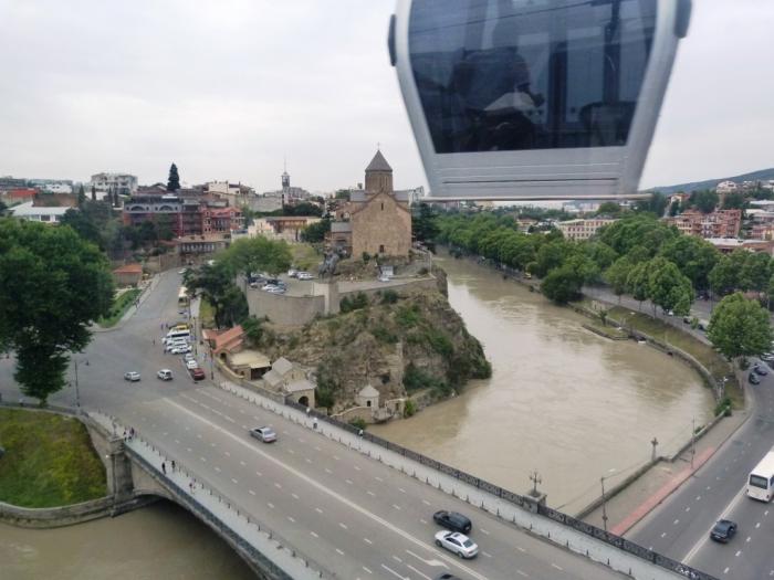 Для проезда по канатке приходится приобрести карточку, действующую и в метро, а на нее положить деньги для оплаты проезда (2 лари с человека). За саму карточку оставляем залог в еще 2 лари, после возвращения мы не поленились и забрали их обратно. Учтите, что продадут вам карточку просто так, а вернут — только по паспорту. Впрочем, и приобретение, и возврат много времени не заняли. И вот мы уже садимся в вагончик, чтобы перелететь через реку и взмыть к древней крепости.