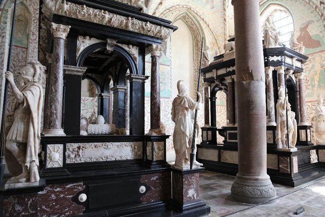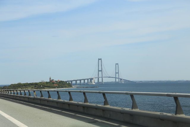 Замок буквально возле моста Большой Белт, так что после объятий мы сразу на него и вырулили. Когда начался мост не сразу и поняли, вроде едем по дороге, а потом понимаем что с боков вода. И мы начинаем над ней потихоньку подниматься. Длиннючий конечно мост, третий в Мире по длине пролёта. На выезде с нас взяли 35 эвро. Перед самим Копенгагеном заезжаем в Роскилле, здесь церковь где покоятся почти все датские короли.