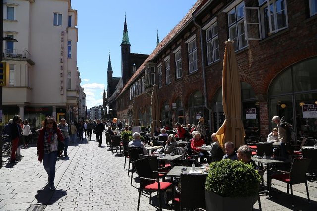 Германия от Польши плюс 30 центов на литр бензина. Дороги супер, в общем не успели оглянуться как уже паркуемся возле отеля “”. Принцип бронь в день заезда опять приносит дивиденды, скидка с 79 до 40эвро. Вдоль отеля ходит трамвай прям в центр, но с учетом что до него всего то 10 минут хода, неспешно идём пешком. Велосипедистов тучи, пешеходы редкость, все на великах. Вот буквально с Ростока мы как бы попали в другие принципы движения, в дальнейшем везде будет глобальное преобладание велосипедов над пешеходами. И метр справа вдоль дороги отведенный для них. При этом он не всегда, то вдоль дороги, то вдоль тротуара. Так что повышенное внимание на съездах.