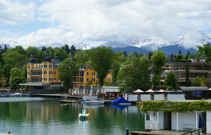 Так как от Граца это совсем недалеко, у нас до заселения оставалось еще достаточно времени, чтобы осмотреть берега озера Вёртерзее. К сожалению, многие участки береговой линии совершенно не доступны для туристов, с той стороны, куда мы подъехали, на несколько километров не было ни одного подхода к озеру. Сплошь заборы, да таблички «частная собственность». Так мы прошли километров пять или больше и только в городке Фельден нашли общественный причал.