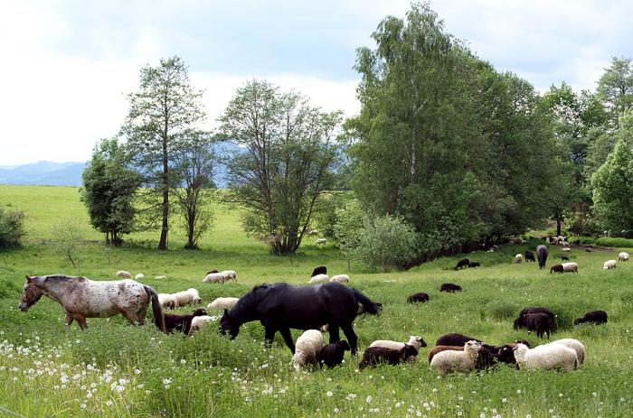 Неподалеку от замка рядом с парковкой мирно пасутся лошади и овцы за несколькими рядами проволоки под напряжением.