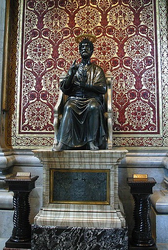 Неподалеку расположенна бронзовая фигура Святого Петра, сидящего на папском престоле и держащего в руке ключи от Царствия Небесного. Ступни апостола уже побелели и стерлись от прикосновений верующих: по поверью, если загадать желание и, держась рукой за стопу Петра, с верой попросить об исполнении задуманного, то все непременно сбудется.