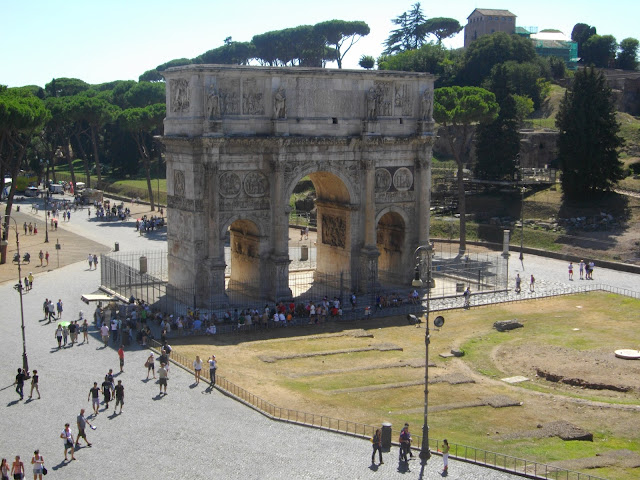Триумфальная арка в Риме, построенная в честь императора Константинанаменитым Колизеем, является самой примечательной среди других. Это строение было возведено в 315 году нашей эры и прославляло победу Константина над Максенцием, а также десятую годовщину его правления. Кроме того, это самая высока триумфальная арка в Риме, которая сохранилась до наших дней – высота этого строения составляет целых 25 метров. Интересным является тот факт, что триумфальная арка Константина была построена в лучших традициях древнего Рима. Для ее возведения были использованы только снятые с других строений материалы. Барельефы триумфальной арки увенчаны сценами правления Константина. Кроме того, украшениями этого сооружения служат сцены их эпох правления других не менее значимых для Рима императоров – Марка Аврелия, Адриана, Траяна, что очень четко символизирует принадлежность Константина к этим мудрым и любимым народом правителям. Символы Великой Римской Империи запечатлены также в цветовом оформлении арки – здесь присутствуют пурпурные и золотые оттенки, символизирующие власть и могущество.
