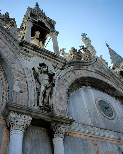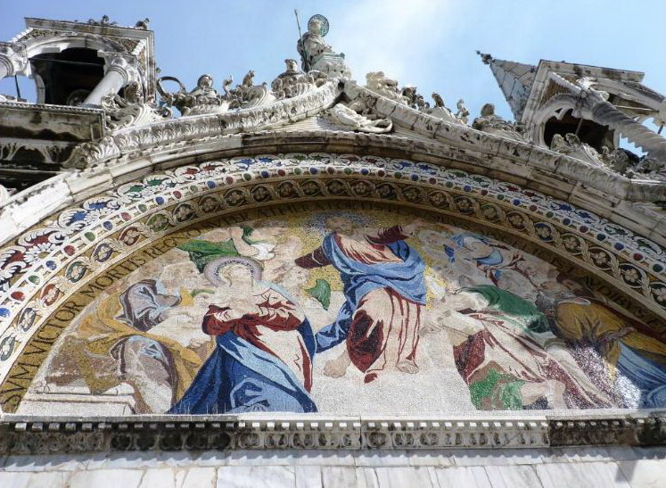 Евангелист Марк считается покровителем Венеции. Легенда рассказывает, что святой Марк (Сан-Марко) однажды возвращался из Аквилеи, где проповедовал христианство, и, застигнутый бурей, был вынужден остановиться на одном из островов Венецианской лагуны. Во сне Марку явился ангел и возвестил, что здесь он обретет покой.Слова, которые произнес ангел, впоследствии были начертаны на знамени Венецианской республики: “Мир тебе, Марк, евангелист мой” (“Pax tibi Marce evangelista? meus”). Апостол Марк умер и был погребен в Александрии, откуда его тело тайно вывезли два венецианских купца. В 828 году мощи святого Марка были доставлены в Венецию, где евангелист нашел вечное упокоение. Так сбылось предсказание ангела. Над гробницей Святого Марка, рядом с дворцом дожей, венецианцы возвели собор Сан-Марко, ставший сердцем Венеции. Первое здание храма погибло в пожаре 976 года, а в 1063 году при доже Доменико Контарини началось строительство нового монументального собора. К 1071 году он был в основном закончен, а в 1094 году состоялось торжественное освящение собора. Но строительство храма продолжалось еще несколько столетий, и каждое новое поколение горожан считало своим долгом украсить здание.