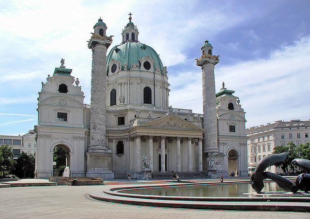 Гуляя по Вене, дошли до собора Карлскирхе (Karlskirche) или собора Святого Карла – не заметить его невозможно. И не только потому, что соборы – можно сказать, основные достопримечательности практически любого города католической Европы, а и потому, что это произведение барочной архитектуры действительно уникально. В настоящее время выдающийся пример венского барокко Собор Святого Карла – храм недействующий, и работает как музей. Расположен он в южной части площади Карлсплац (Karlsplatz) практически на границе исторического центра Вены – района Внутренний город, ограниченного Рингштрассе.