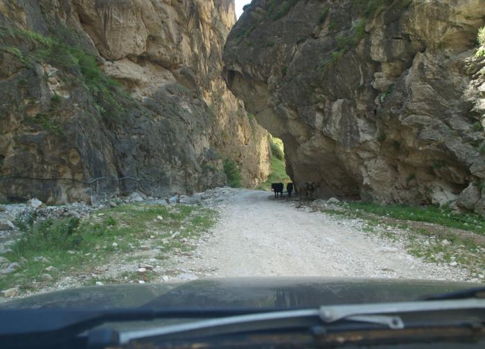 …а на въезде полицейский блок — пост. Служивые на мое появление реагируют почти так же, как на посту в Дагестане, только, помимо пожелания «счастливого пути», советуют быть внимательнее на выезде из села, чтобы попасть на объездную дорогу. Кусок основной трассы, оказывается, разрушен оползнем. И все же немного блужу в поисках нужной дороги. Хорошо, местный мужичок подсказывает, где нужно свернуть.