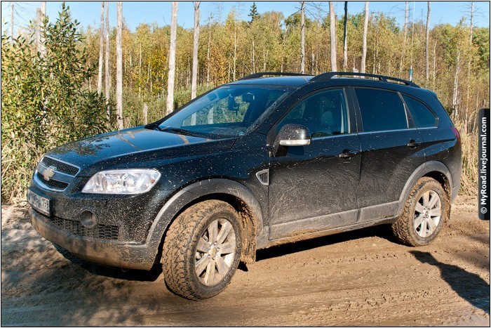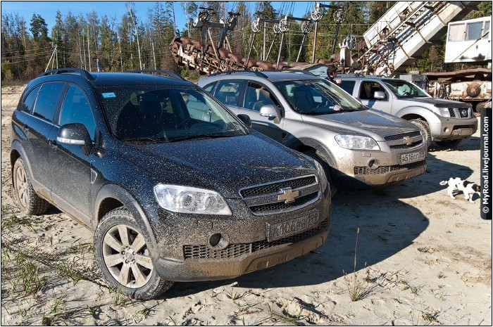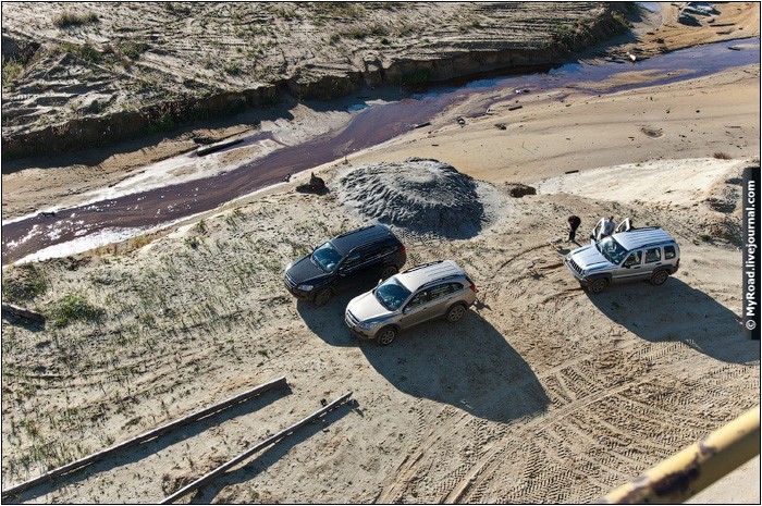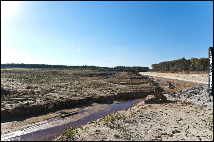 Встретились рано утром, но как обычно бывает, попадаем в хорошую пробку на Новорязанском шоссе. А ехать именно по нему, т.к. рудники находятся недалеко от Воскресенска. Из отчета взял координаты рудников, забил их в навигатор. Смело двигаемся по дороге, которую указывает нам электронный прибор. Вот тут начинается интересная часть. Все дороги не то что без покрытия, а просто насыпь, пытаемся пробраться к руднику, но по навигатору мы все больше и больше удаляемся от них, заезжая все глубже и дальше в лес, где дороги уже кончаются и продолжаются для больших и подготовленных машин. Как я узнал позже, во-первых этот участок дороги самый ровный и все что дальше действительно излюбленные места для подготовленных джип-клубов, во-вторых мы не с той стороны деревни пытались заехать. На фото самый лучший ровный участок. Есть видеоряд, где мы катаемся туда-сюда и пытаемся найти дорогу, но он канул в никуда с сгоревшим винчестером :(