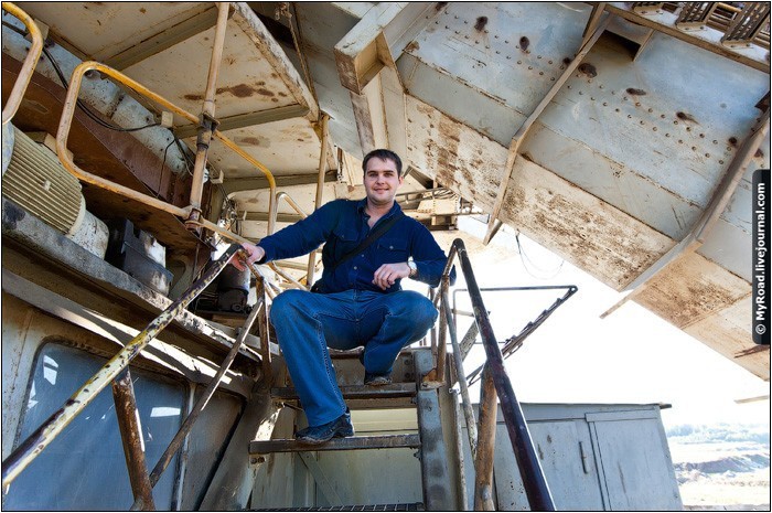 Ту мы замечаем, что в экскаваторе есть охранник. Мы попросили его провести нам экскурсию. На удивление, мы получили сразу же положительный ответ и мы поднялись по ступеням вверх. Охранник разрешил нам фотографироваться внутри и провел хорошую экскурсию, рассказал много об этом монстре и самое главное то, что экскаватор скоро возобновит свою работу. Ведь простой был связан с кризисом и страна уже вроде как выкарабкивается из него.