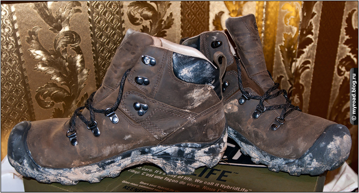 А ниже фото моих трекинговых ботинок после пещер. Специально поехал покупать подарок себе на День Рождения. Хотел купить берцы, необходимо было поехать в магазин, помереть и выбрать для себя, что мне больше всего удобно и по отзывам в сети выбрать достойную фирму производителя. Однако, все что было в продаже, никак не подходило моей ноге или были слишком дороги. Совершенно случайно попал на распродажу трекинговой обуви фирмы KEEN и нашел то, что для меня очень удобно. Ботинки из прошлогодней коллекции и была хорошая скидка. Если не ошибаюсь, я забрал последнюю пару, плюс прикупил рекламируемые носки для них. Обувь KEEN проверял зимой в этих носках. В общем, носки фуфло, но несколько часов продержался. Испытания показали следующее — лучше всяких наноносков только хорошие честные шерстяние носки, но я могу ошибаться, ведь нано носки стоили не бешеные тыщи, а всего лишь несколько сотен рублей.