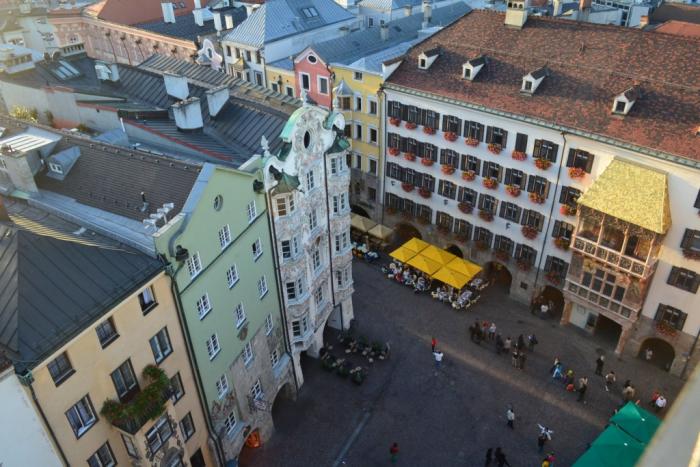 В Инсбруке для этой цели больше всего приспособлена башня в здании бывшей ратуши. Несколько минут— и вот уже вы смотрите сверху вниз на золотую ложу и вдаль—на кольцо Альп вокруг города. Кстати, билет на башню дает право бесплатного посещения туалета.