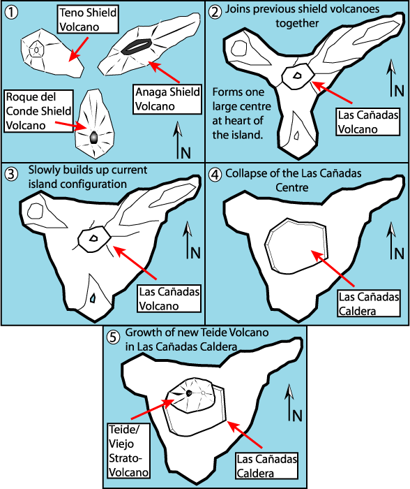 «1. На первоначальном этапе между эпохой миоцена и плиоцена из океана поднялись 3 вулкана: Тено (на северо-западе), Анага (на северо-востоке) и Роке дель Конде (на юге).