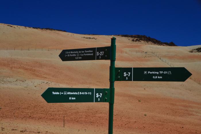 Первый указатель на тропе – до приюта Альтависта на вершине Тейде «всего-то» 8 километров, наша конечная цель не указана, но мы знаем: до Montana Blanco пять с половиной километров в один конец, перепад высоты – 390 метров.