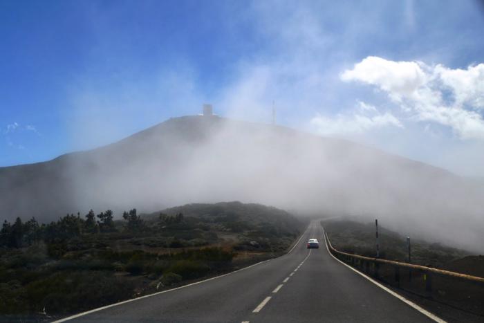 Сначала дорога забирается вверх, петляя по заросшим соснами склонам. Но с высоты 2000 метров пейзаж меняется. Здесь интересно ехать из-за видов на обсерваторию, которая превращает и без того марсианский пейзаж в нечто инопланетно-фантастическое.